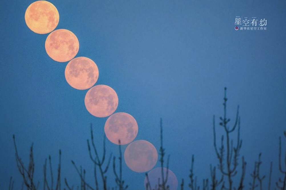 2023年2月5日,元宵节,“十五的月亮十六圆”。这是北京市星空摄影爱好者王俊峰2月6日在北京丰台区拍摄的“月落过程”(多张叠加)。(本人供图)