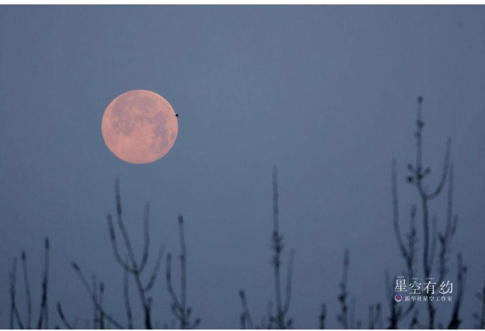 2023年2月5日,元宵节,“十五的月亮十六圆”。这是北京市星空摄影爱好者王俊峰2月6日在北京丰台区拍摄的“飞鸟掠圆月”。(本人供图)