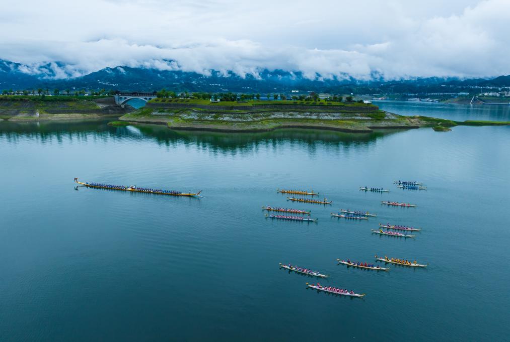 湖北省秭归县举行龙舟训练迎端午(无人机照片)。新华社发(郑家裕摄)