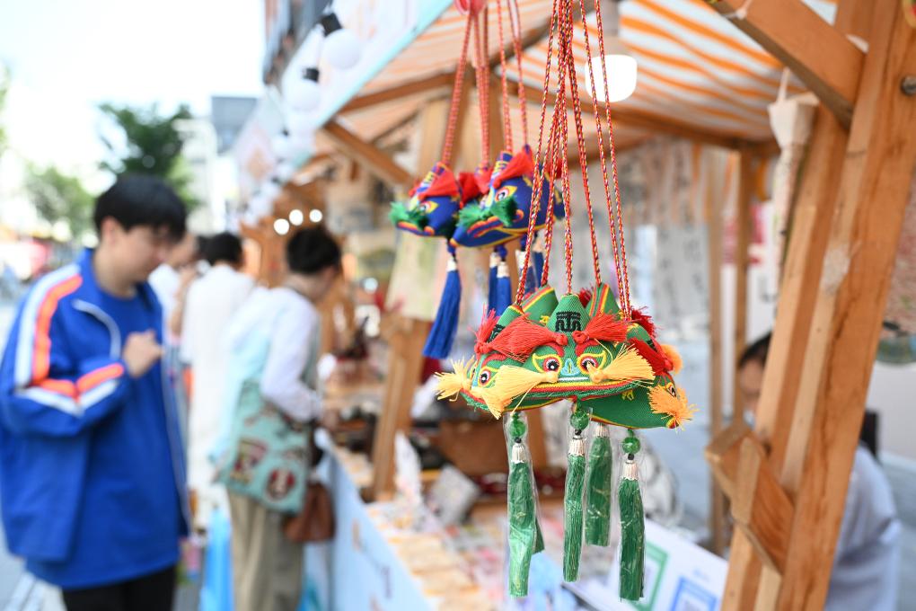 端午节到来,在浙江省嘉兴市南湖区少年路的端午非遗集市现场,摊位上悬挂起端午香囊。新华社发(徐志达摄)