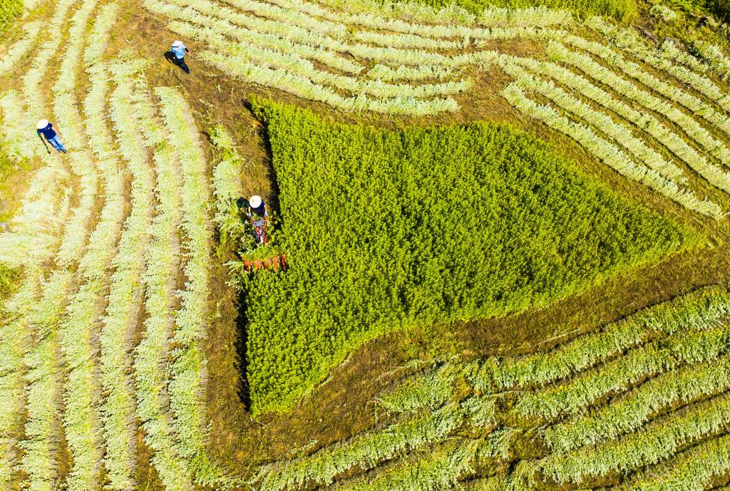 2024年5月24日,湖北省宜昌市秭归县两河口镇云盘村村民在田间收割艾草(无人机照片)。新华社发(郑家裕摄)