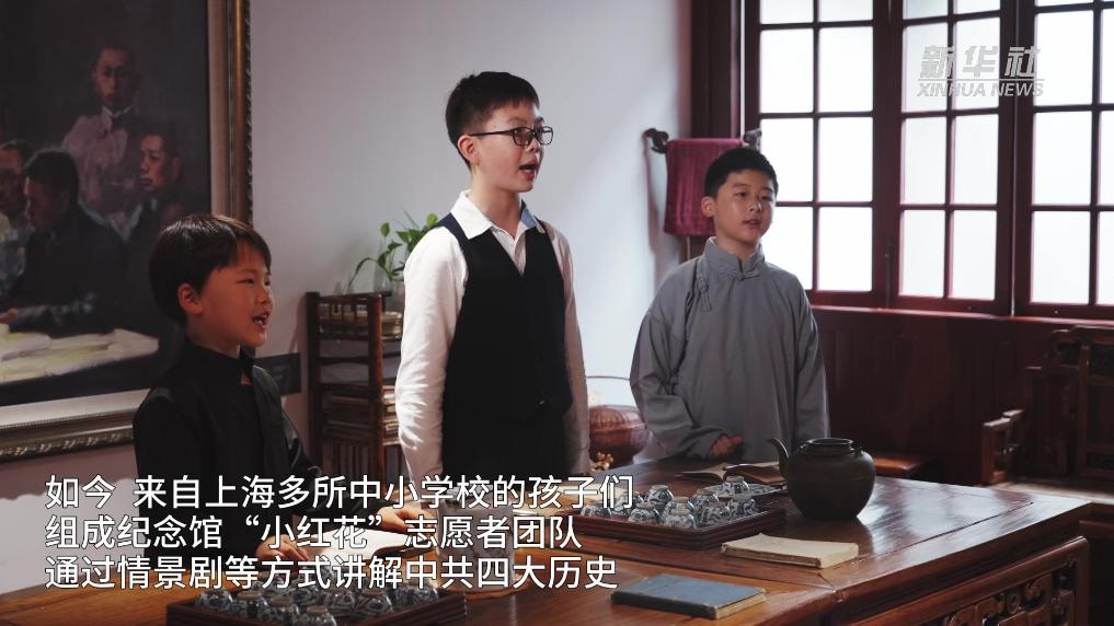 纪念馆场景再现厅还原了当年广吉里的会议场景:一块写着英文的黑板,长条桌边围着一圈木凳。如今,这个场景成为“红色课堂”,来自上海多所中小学校的孩子们组成纪念馆“小红花”志愿者团队,通过情景剧等方式,讲解中共四大历史。