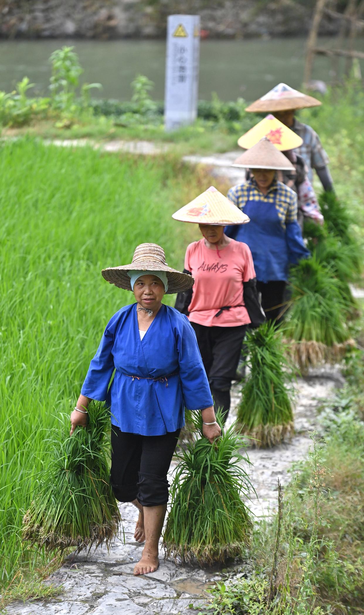 在广西柳州市三江侗族自治县林溪镇平岩村,村民在搬运秧苗,准备插秧(7月7日摄)。 新华社记者 黄孝邦 摄