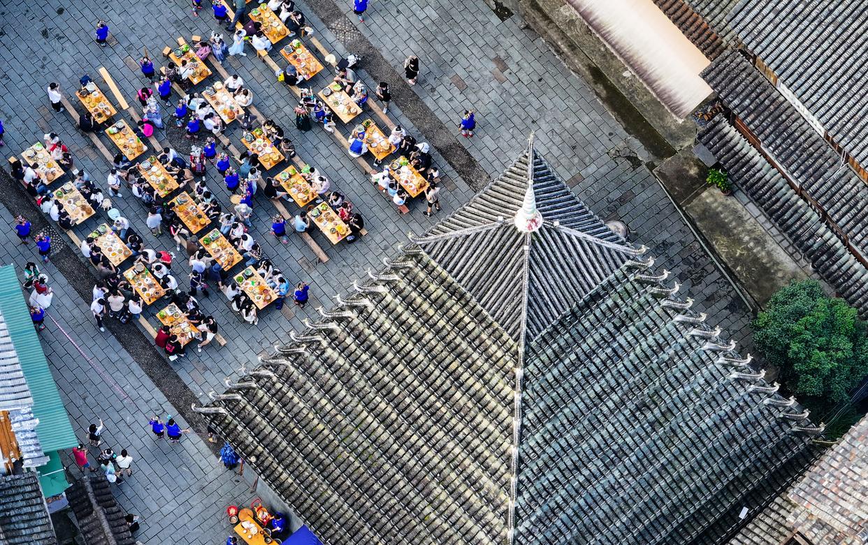 在广西柳州市三江侗族自治县林溪镇平岩村,游客在体验百家宴(无人机照片,7月6日摄)。 新华社记者 黄孝邦 摄