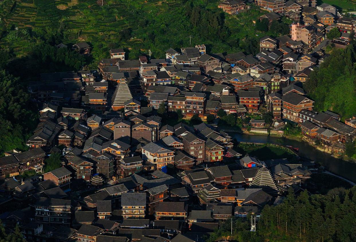 夕阳下的广西柳州市三江侗族自治县林溪镇平岩村(无人机照片,7月7日摄)。 新华社记者 黄孝邦 摄