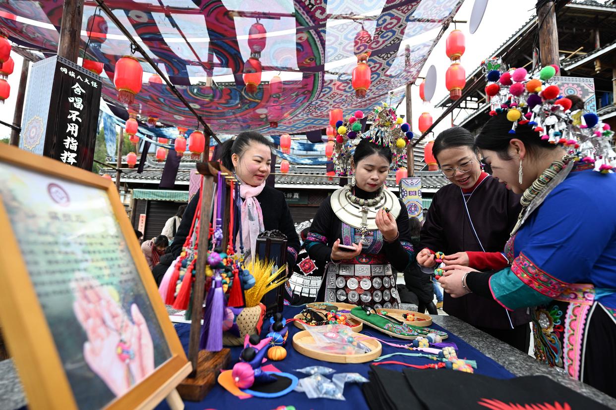 在广西柳州市三江侗族自治县林溪镇平岩村,游客在选购侗族非遗手工艺品(2月3日摄)。 新华社记者 黄孝邦 摄