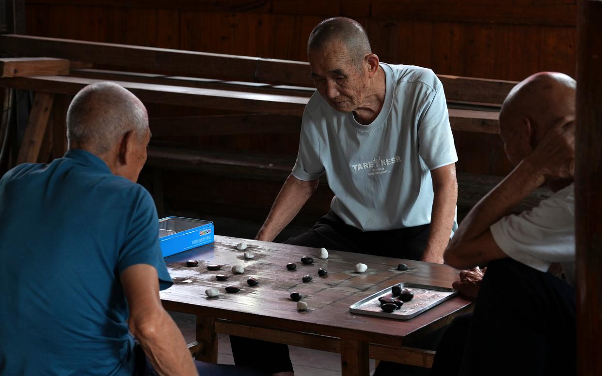 在广西柳州市三江侗族自治县林溪镇平岩村,老人在鼓楼里下棋(7月9日摄)。新华社发(吴练勋 摄)