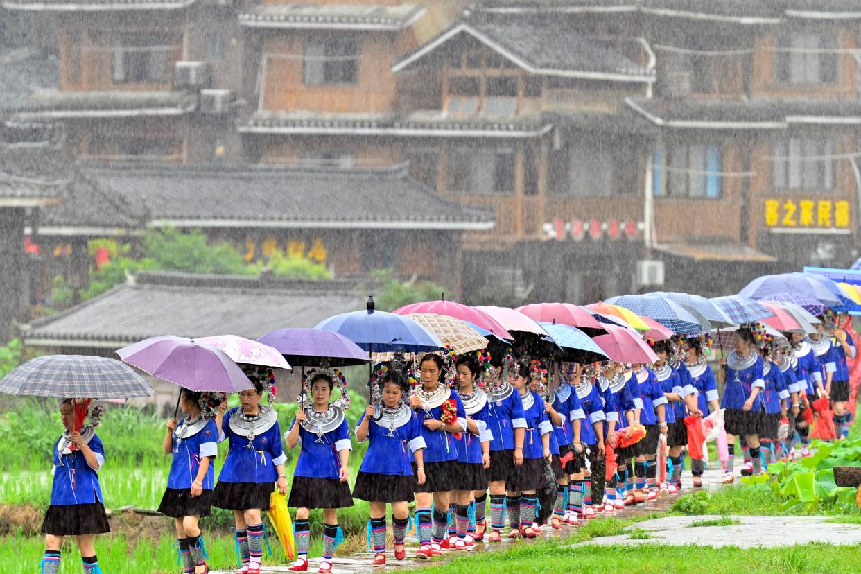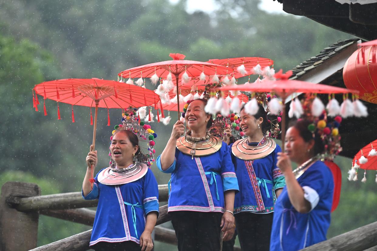 在广西柳州市三江侗族自治县林溪镇平岩村,妇女们身穿节日盛装,庆祝程阳永济桥落成100周年(6月18日摄)。 新华社记者 黄孝邦 摄