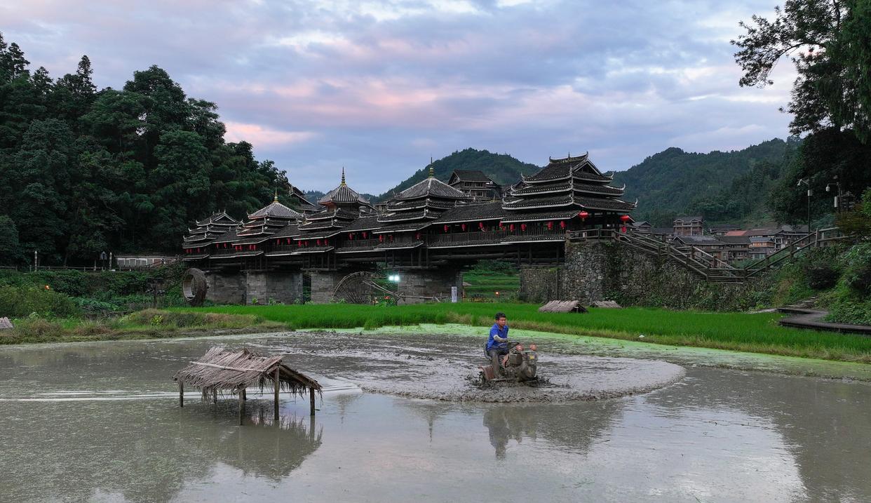 在广西柳州市三江侗族自治县林溪镇平岩村,村民在插秧前犁田(7月7日摄)。 新华社记者 黄孝邦 摄