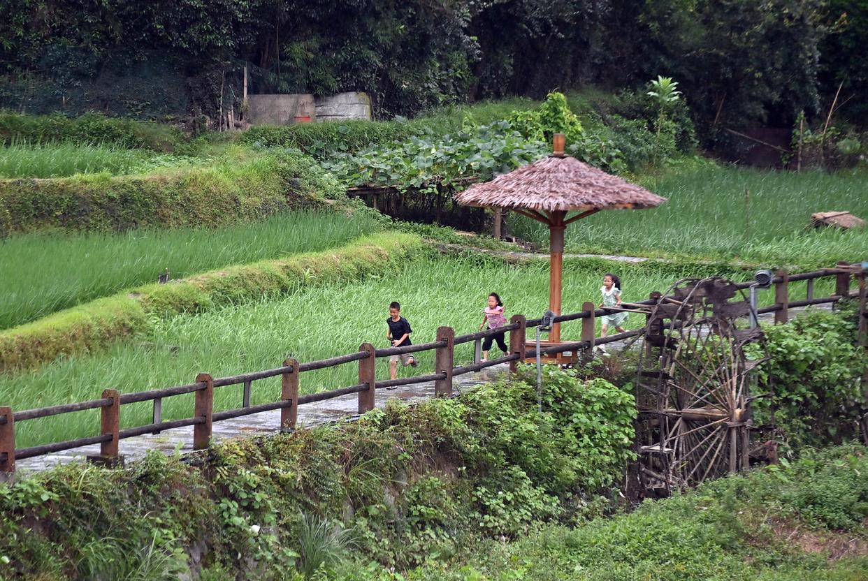 在广西柳州市三江侗族自治县林溪镇平岩村,小朋友在雨中奔跑(7月6日摄)。 新华社记者 黄孝邦 摄