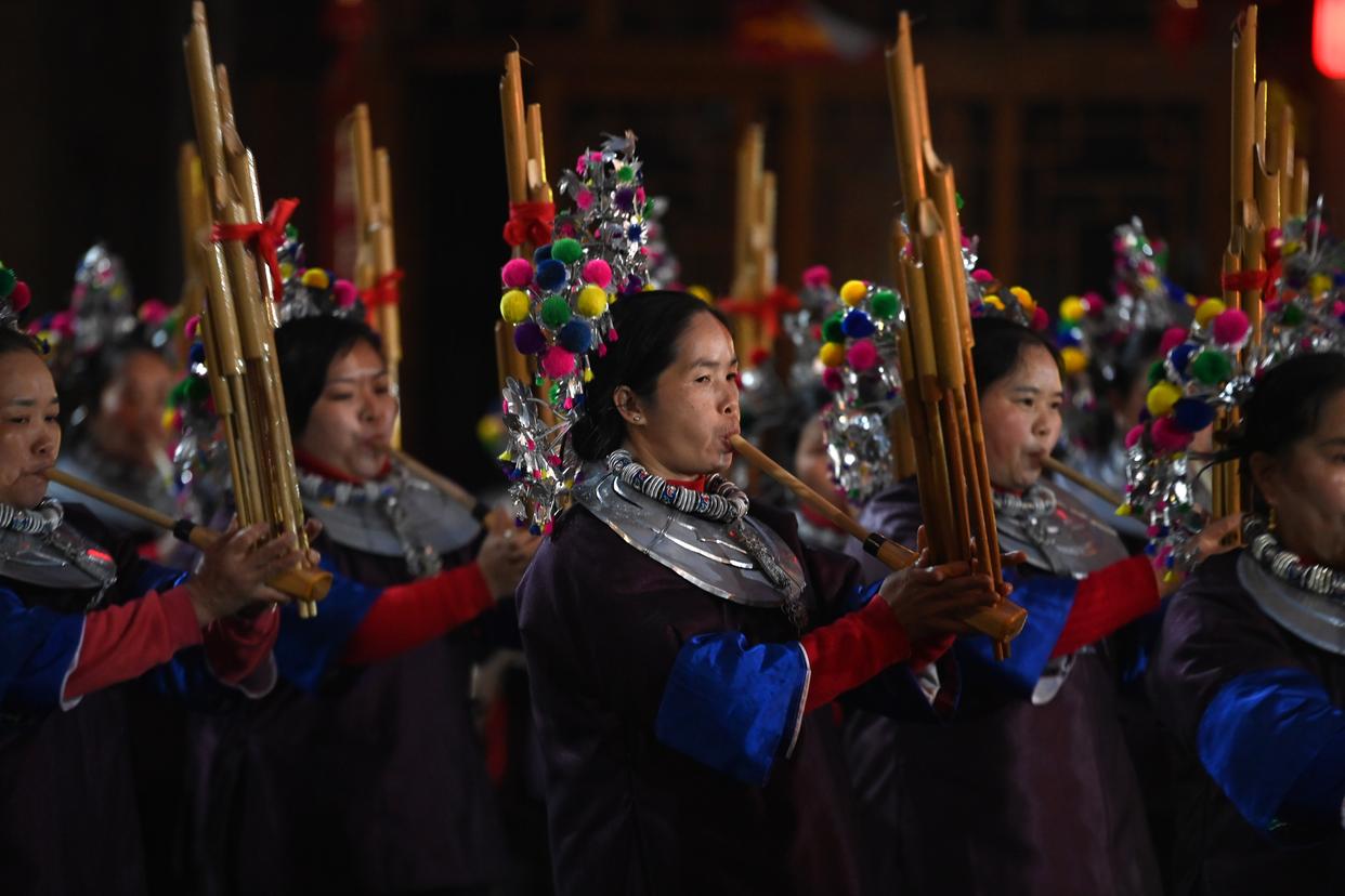 在广西柳州市三江侗族自治县林溪镇平岩村,村民在表演吹芦笙(1月28日摄)。 新华社记者 黄孝邦 摄