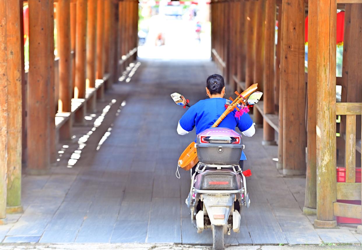在广西柳州市三江侗族自治县林溪镇平岩村,村民背着侗族琵琶去上班(7月7日摄)。 新华社记者 黄孝邦 摄