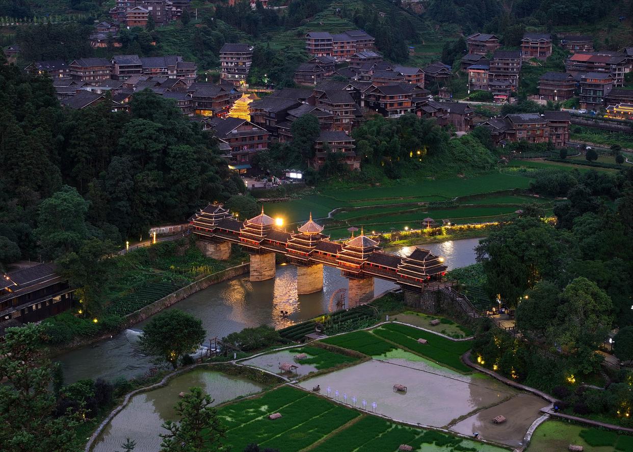这是广西柳州市三江侗族自治县林溪镇平岩村夜色(无人机照片,7月7日摄)。 新华社记者 黄孝邦 摄