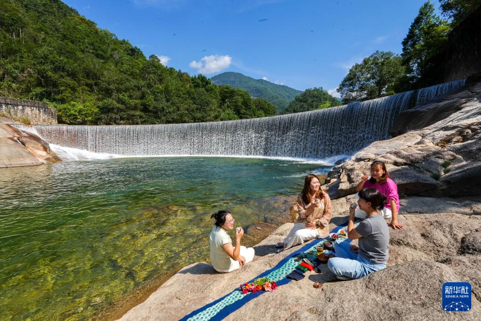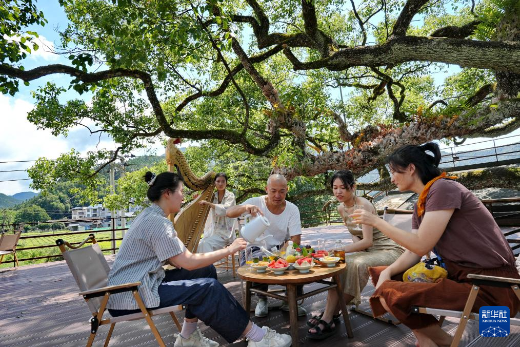 7月11日,星村镇村民在溪水边摆茶席,享受茶乡慢生活。新华社发(陈颖 摄)