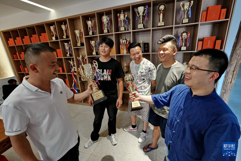 星村镇年轻茶农展示自己在斗茶赛上获得的奖杯(7月10日摄)。新华社发(陈颖 摄)