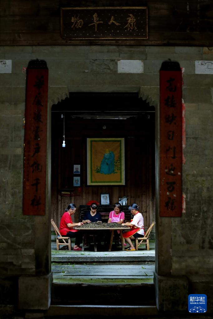 星村镇茶农在一处古宅内挑拣茶叶(7月10日摄)。新华社发(陈颖 摄)