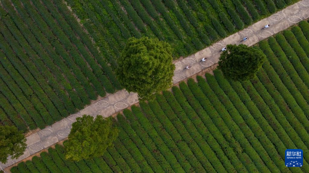 7月11日,游人在星村镇生态观光茶园内骑行(无人机照片)。新华社发(陈颖 摄)
