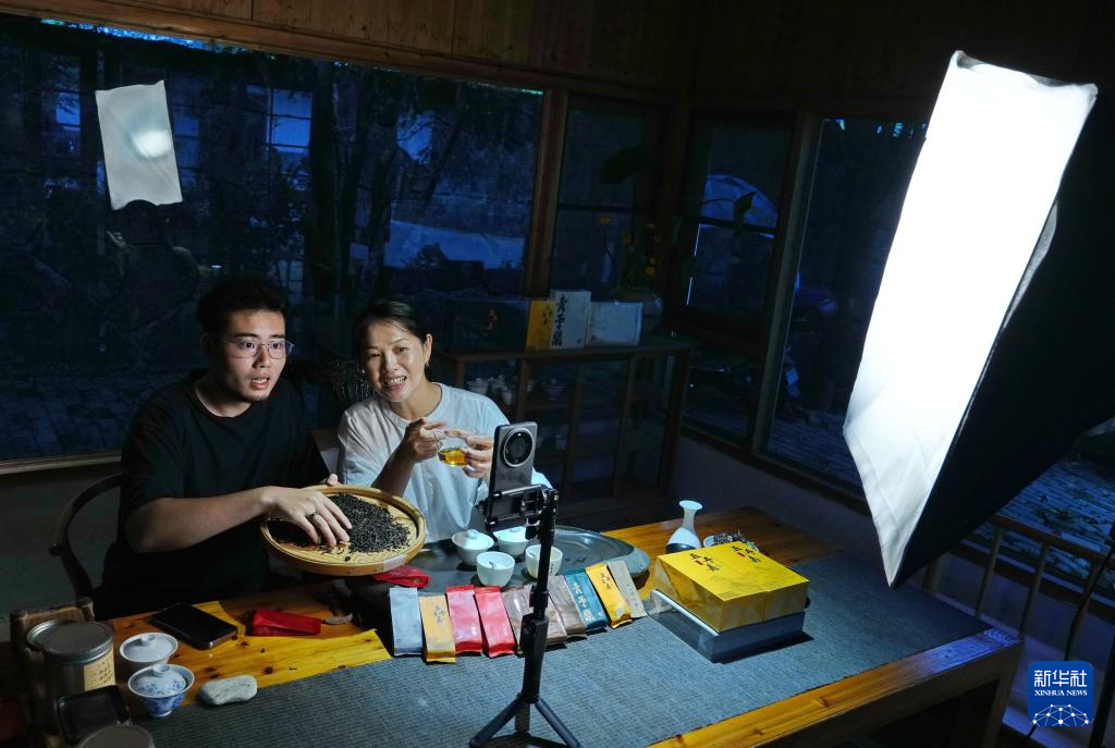 星村镇年轻茶农利用网络直播推介自己制作的新茶(7月11日摄)。新华社发(陈颖 摄)