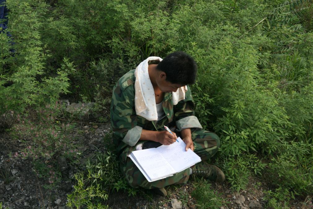 张卫东在巡护长城途中席地而坐记录数据。(受访者供图)