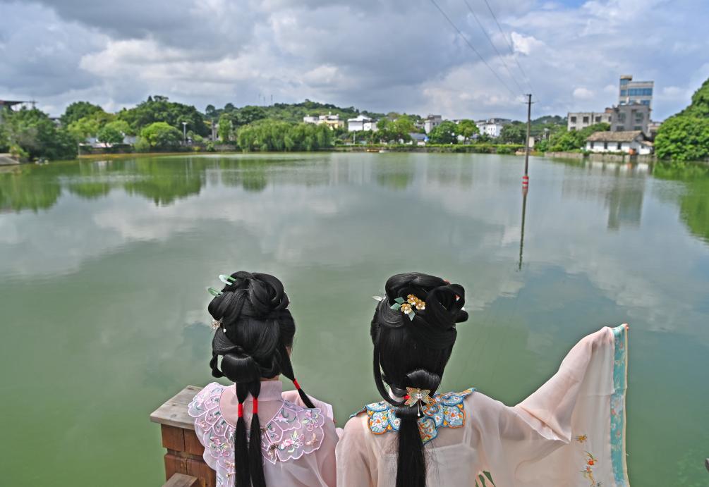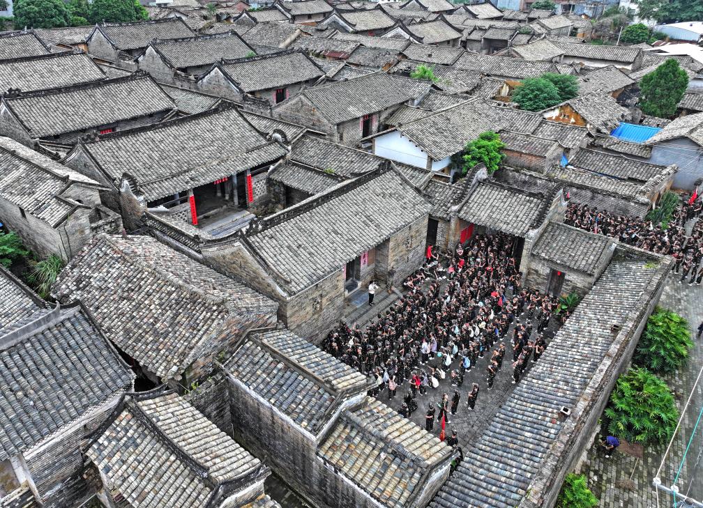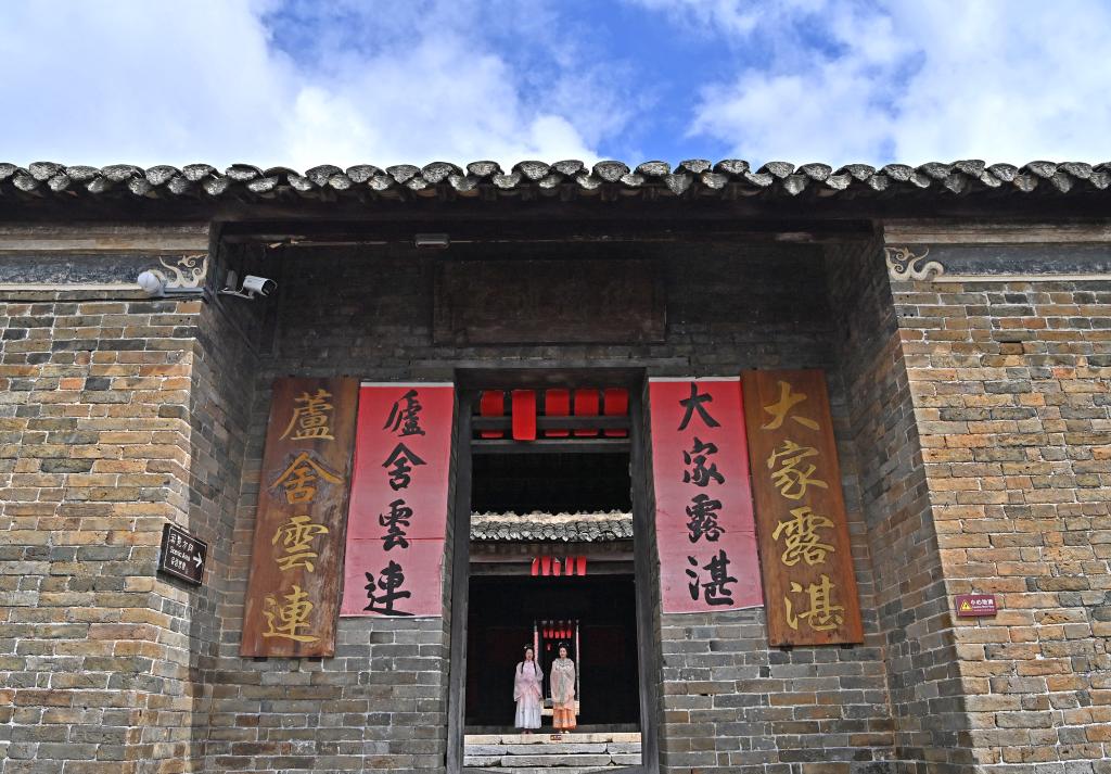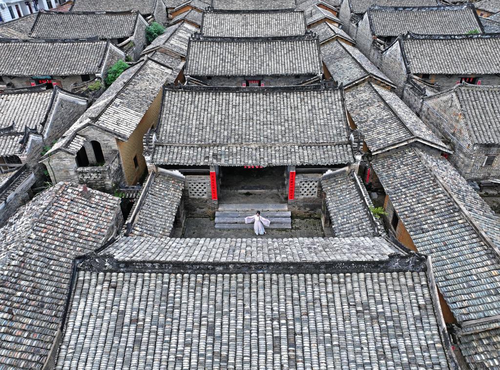 一名身着汉服的游客在大芦村古建筑群里起舞(8月16日摄,无人机照片)。