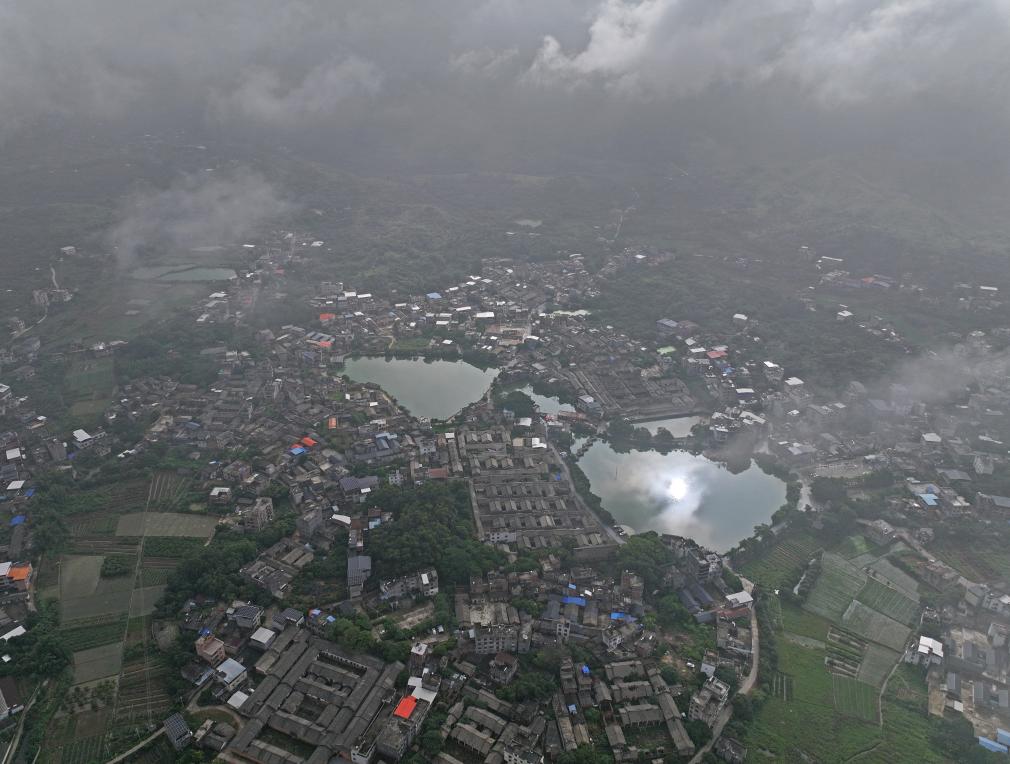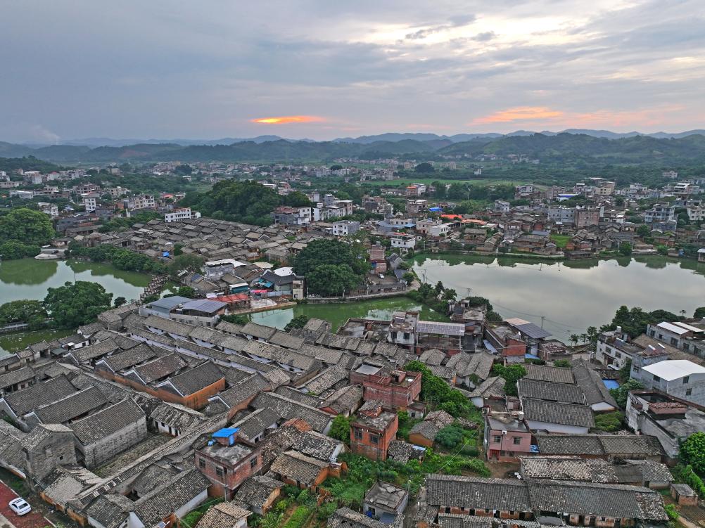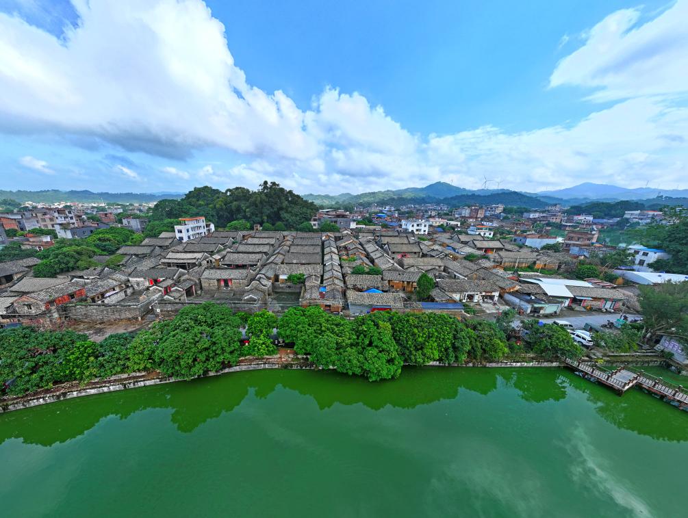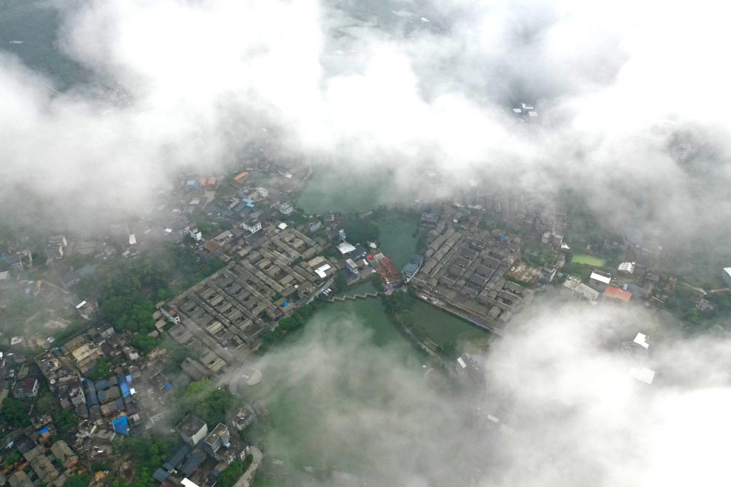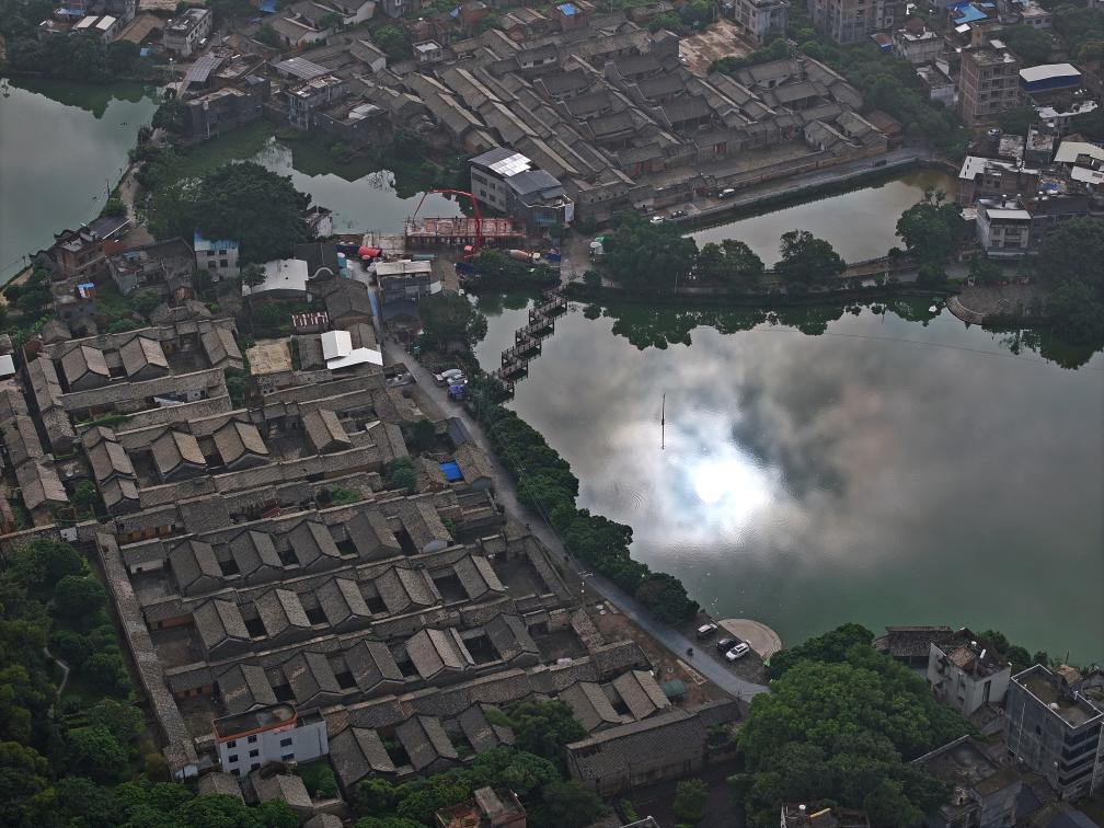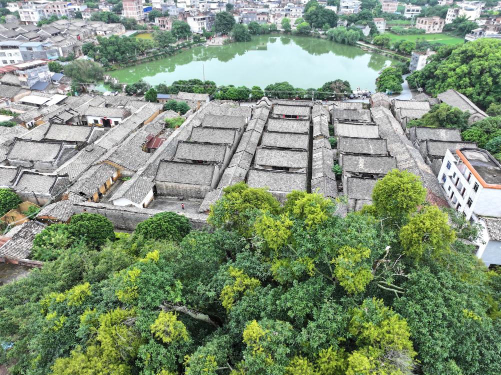 镬耳楼前有人工池塘,后有巨大梐树(8月16日摄,无人机照片)。