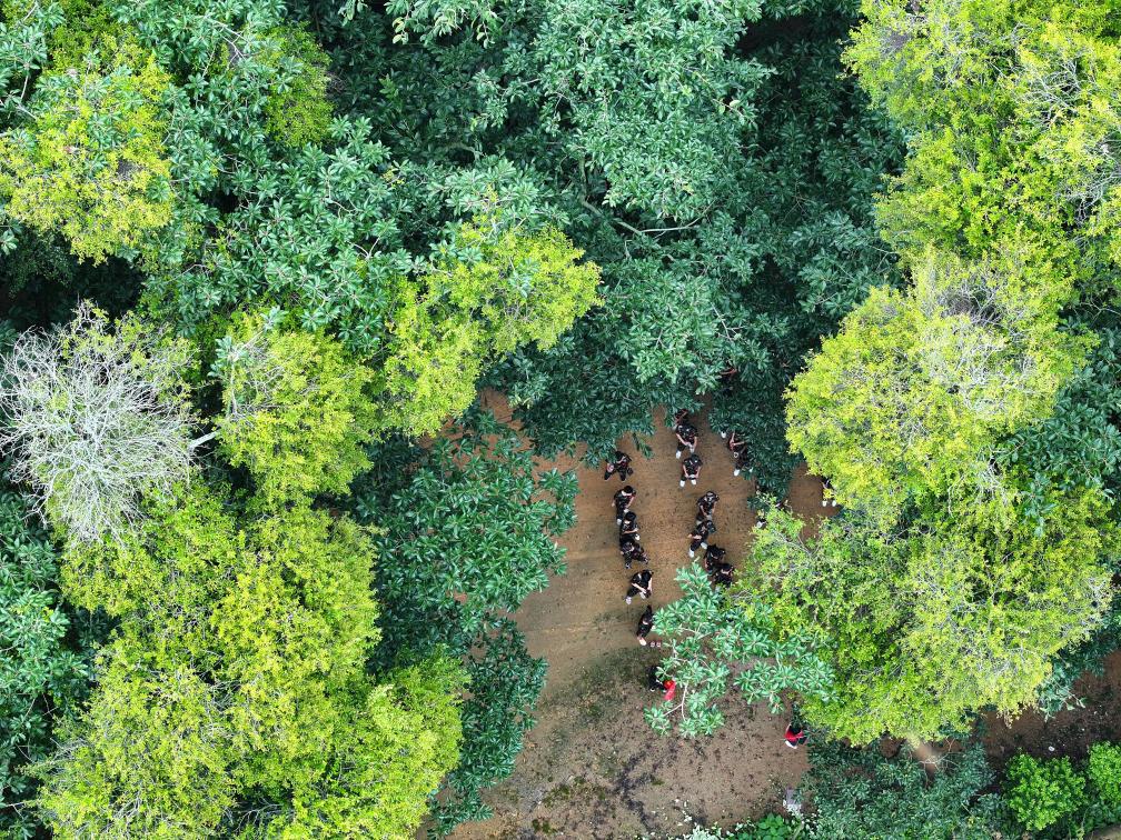 当地学生在大芦村巨大的梐树下了解村史(8月16日摄,无人机照片)。