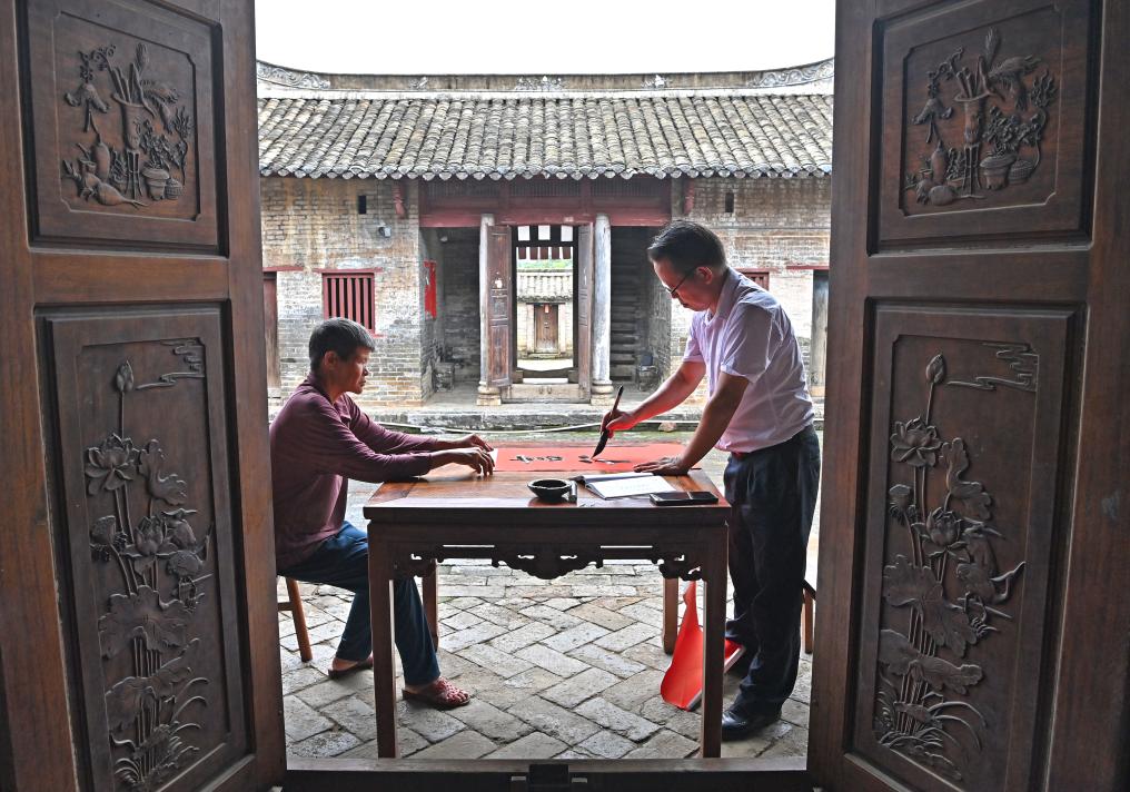 楹联爱好者周启钟在大芦村古宅里写对联(8月15日摄)。