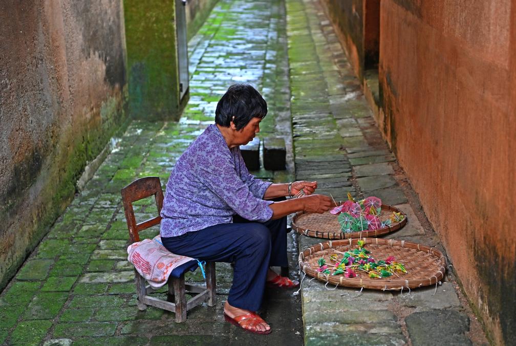 村民黄佐凤在大芦村古宅里做手工(8月15日摄)。