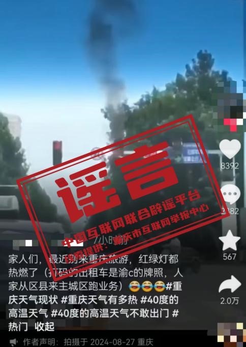 真相:近日,某网民发布视频并配文“最近别来重庆旅游,红绿灯都热燃了”,引发关注。经当地网信部门核实,重庆近期未发生此类事件,网传信息系谣言。该视频实为2017年7月17日外省某地一处路口红绿灯高温自燃的画面,消防部门迅速将明火扑灭。某网民将该事件“移花接木”,恶意编造“重庆红绿灯热燃了”谣言。(来源:“重庆辟谣”微信公众号)