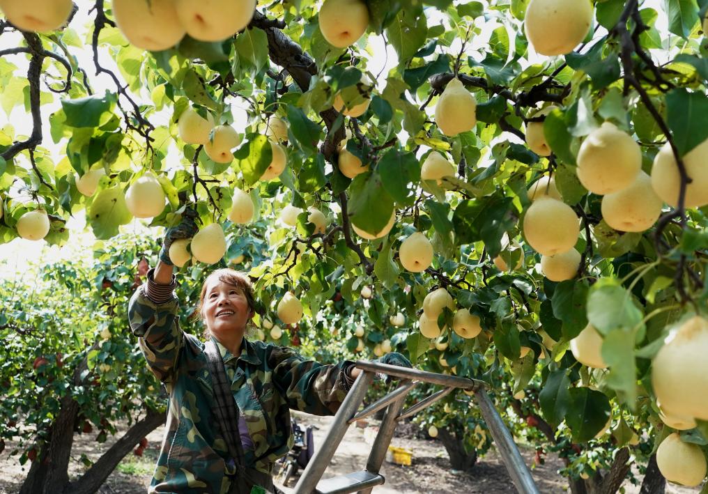 9月13日,河北省晋州市的农民在果园采摘鸭梨。新华社记者杨世尧 摄