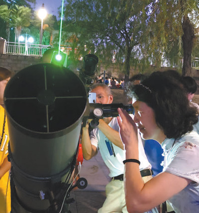 2023年中秋节,张家赫和南斗天文社的同学把望远镜架到一座天桥上,一边观测一边为路人讲解。好奇的行人停下脚步,一些小朋友被父母抱起来在望远镜前看了又看。天桥下车水马龙,天桥上一轮圆月,那一刻让张家赫和同学们至今难忘。