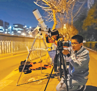 北京市第八中学南斗天文社同学在路边观测。 王文智摄(人民视觉)