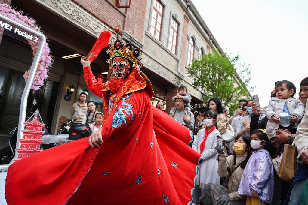 在泉州中山路,游客观看变脸表演。新华社记者 周义 摄