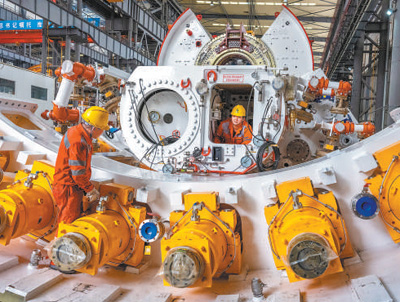 广东佛山市顺德区中铁华隧联合重型装备有限公司,工人们在调试盾构机。 王美燕摄(影像中国)