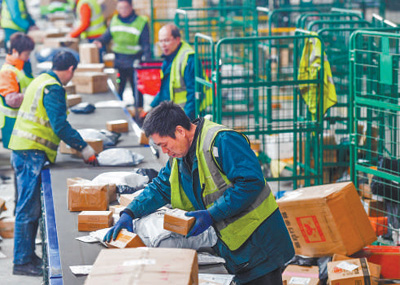 湖南道县,中国邮政工作人员分拣快递包裹。蒋克青摄(影像中国)
