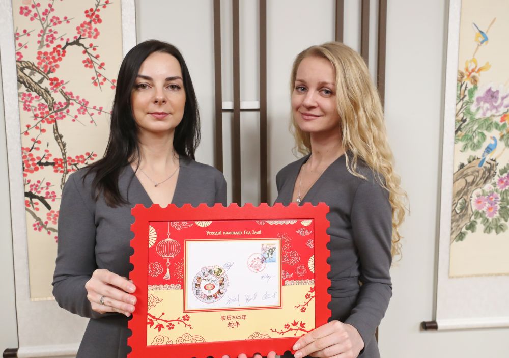 1月15日,工作人员在白俄罗斯明斯克展示《东方历法:蛇年》邮票首日封。新华社发(任科夫摄)