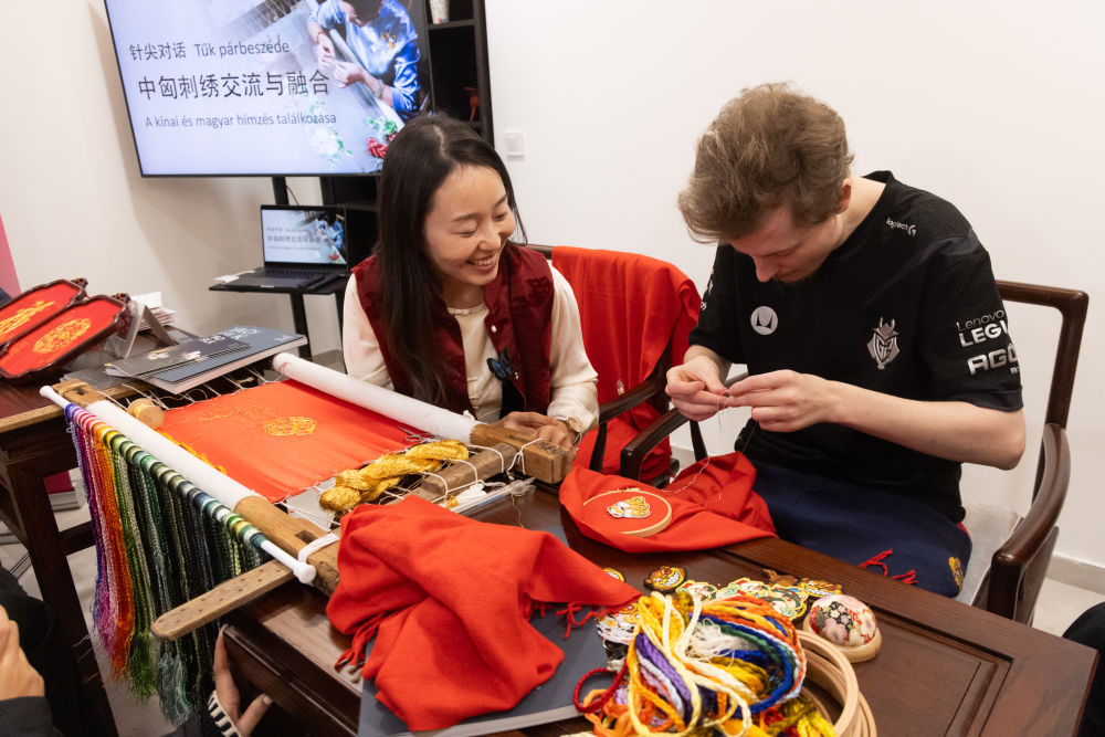 1月17日,在匈牙利布达佩斯,一名男子在2025“欢乐春节”活动上体验苏绣。新华社发(弗尔季·奥蒂洛摄)