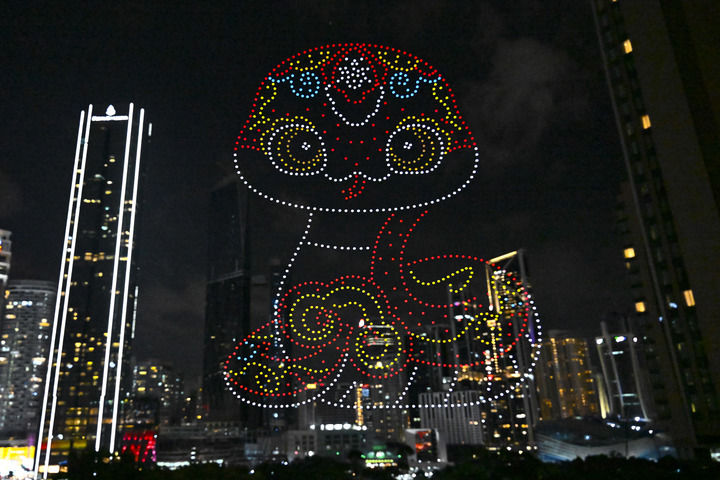 1月25日,在马来西亚吉隆坡举行的2025年“欢乐春节”全球启动仪式前,无人机展示蛇年主题图案。新华社记者 程一恒 摄