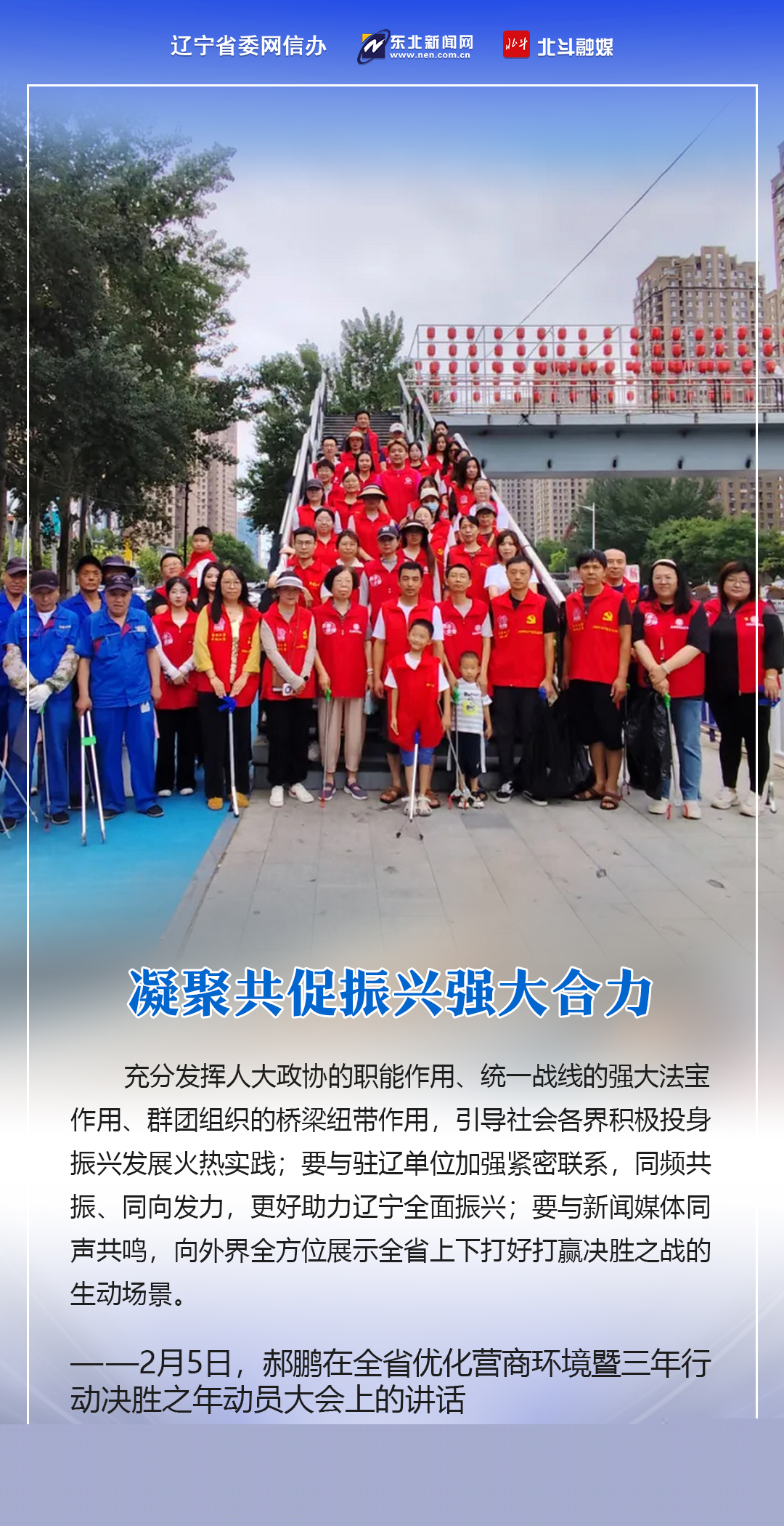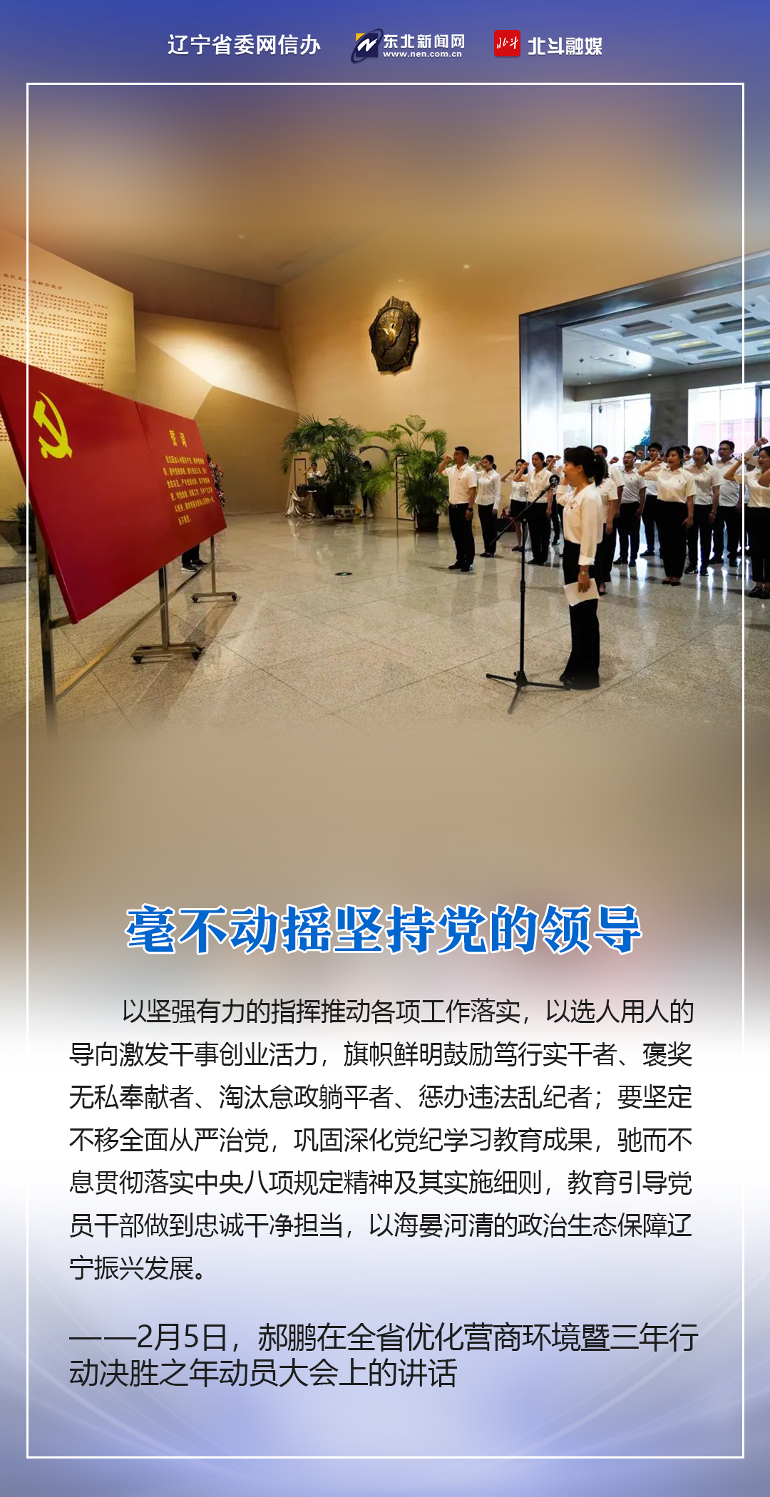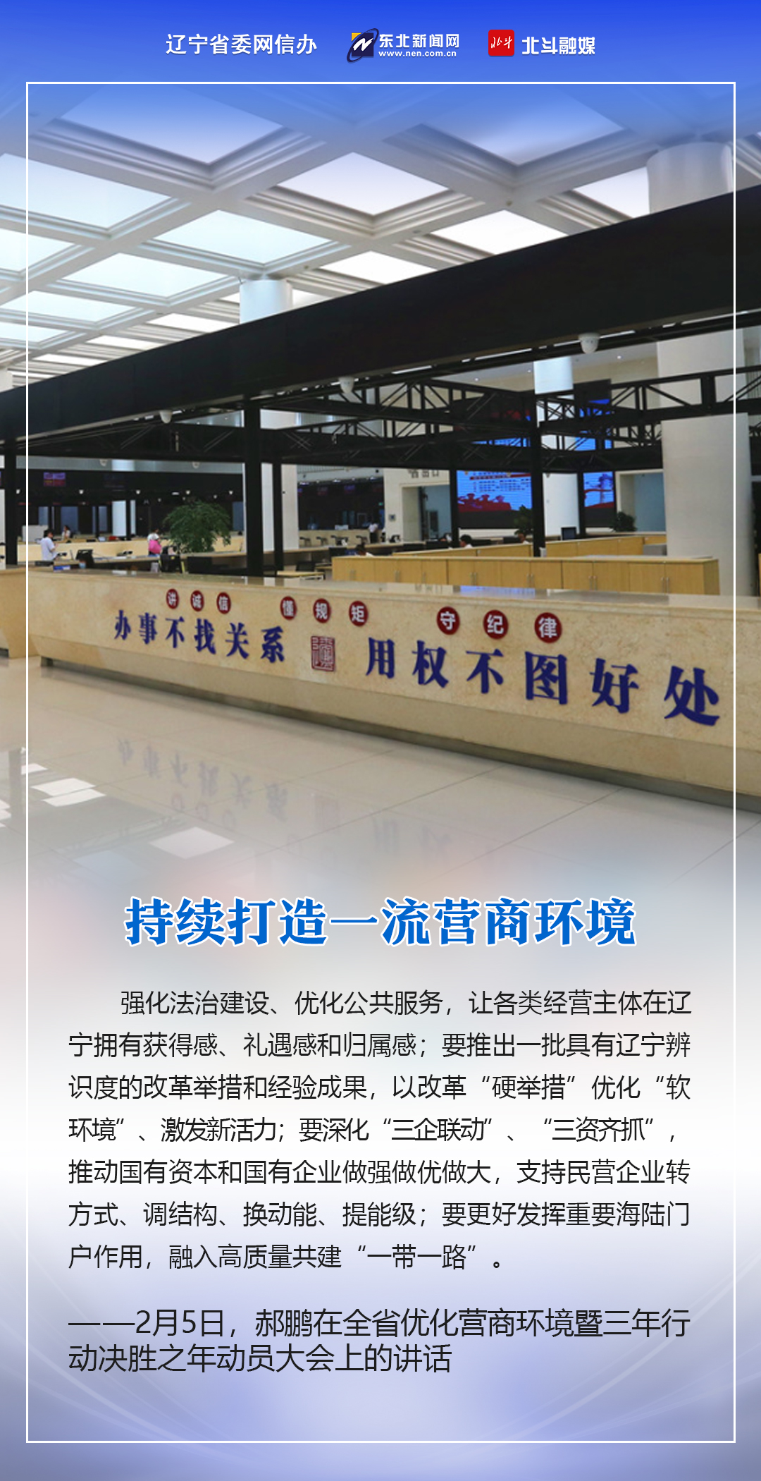 2月5日,蛇年春节后第一个工作日,全省优化营商环境暨三年行动决胜之年动员大会在沈阳召开。省委书记、省人大常委会主任郝鹏出席会议并讲话,强调要用心感悟习近平总书记为辽宁擘画新篇的立意之深、思量之远,用心感悟习近平总书记对辽宁振兴发展的深情牵挂、亲切关怀,从中汲取砥砺奋进力量,以“起步冲刺、决胜全年”的决心和姿态,打好打赢三年行动决胜之年决胜之战,圆满完成“十四五”规划和三年行动目标任务,以实际行动践行习近平总书记殷殷嘱托、回报习近平总书记关怀厚爱。