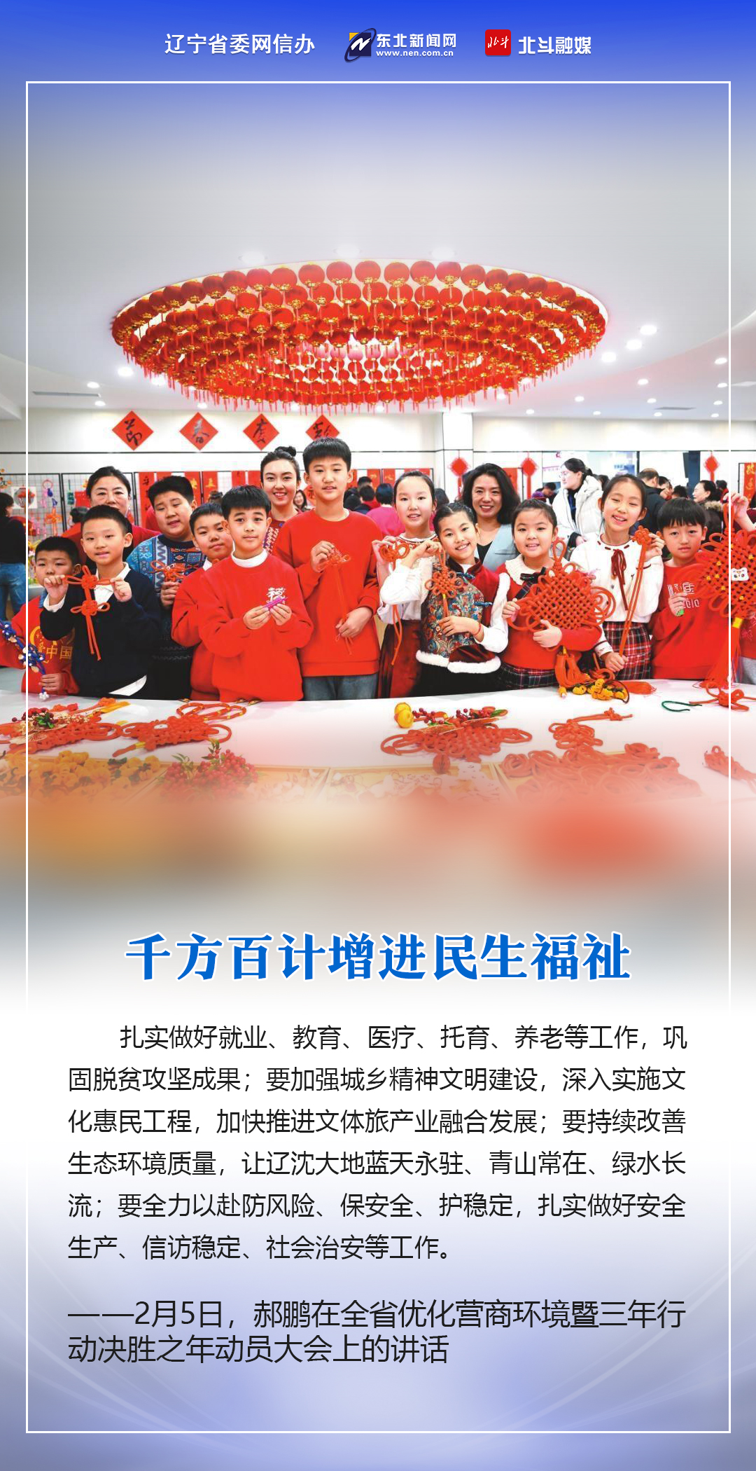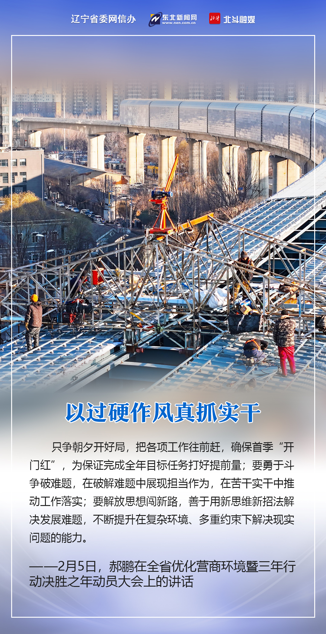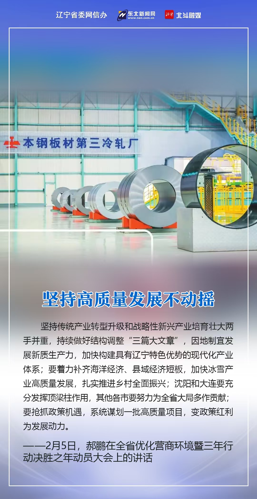 2月5日,蛇年春节后第一个工作日,全省优化营商环境暨三年行动决胜之年动员大会在沈阳召开。省委书记、省人大常委会主任郝鹏出席会议并讲话,强调要用心感悟习近平总书记为辽宁擘画新篇的立意之深、思量之远,用心感悟习近平总书记对辽宁振兴发展的深情牵挂、亲切关怀,从中汲取砥砺奋进力量,以“起步冲刺、决胜全年”的决心和姿态,打好打赢三年行动决胜之年决胜之战,圆满完成“十四五”规划和三年行动目标任务,以实际行动践行习近平总书记殷殷嘱托、回报习近平总书记关怀厚爱。