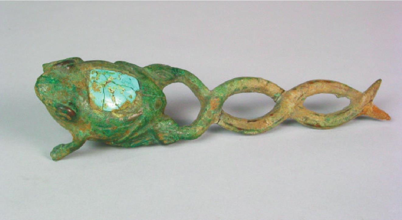 这件文物为铜铸。它构思巧妙,将蛙与蛇的形态精妙融合在一起。文物中的蛙仿佛从远古的泥沼中跃然而出,前肢稳稳撑立,似在诉说着坚韧与不屈,后肢收屈,蓄满力量;灵动的是两条蛇,蜿蜒而来,各衔住蛙的后肢,蛇身缠绵、纠结,勾勒出3个椭圆形穿孔,恰似时光的眼眸,窥探着往昔。蛇尾俏皮地微微上翘,截面呈半圆形。