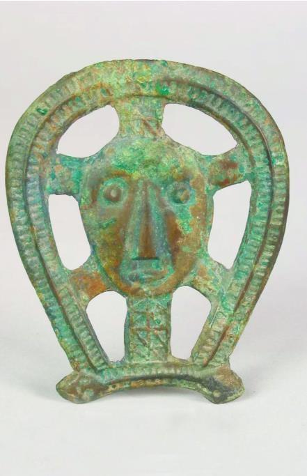 “双头蛇人面铜牌饰”中间为一人面形,突额、长鼻、突唇、圆眼,外边是由身体相连的两条蛇盘曲构成的圈框,在人面与蛇形圈框之间有6个宽辐条形连接支撑,人面上下的两个宽辐条上饰有三角形花纹,背面有一穿鼻。牌饰的人物造型较罕见,当属典型的北方人种特征,为研究使用青铜短剑的古辽东地区人群族属提供了非常有价值的资料。