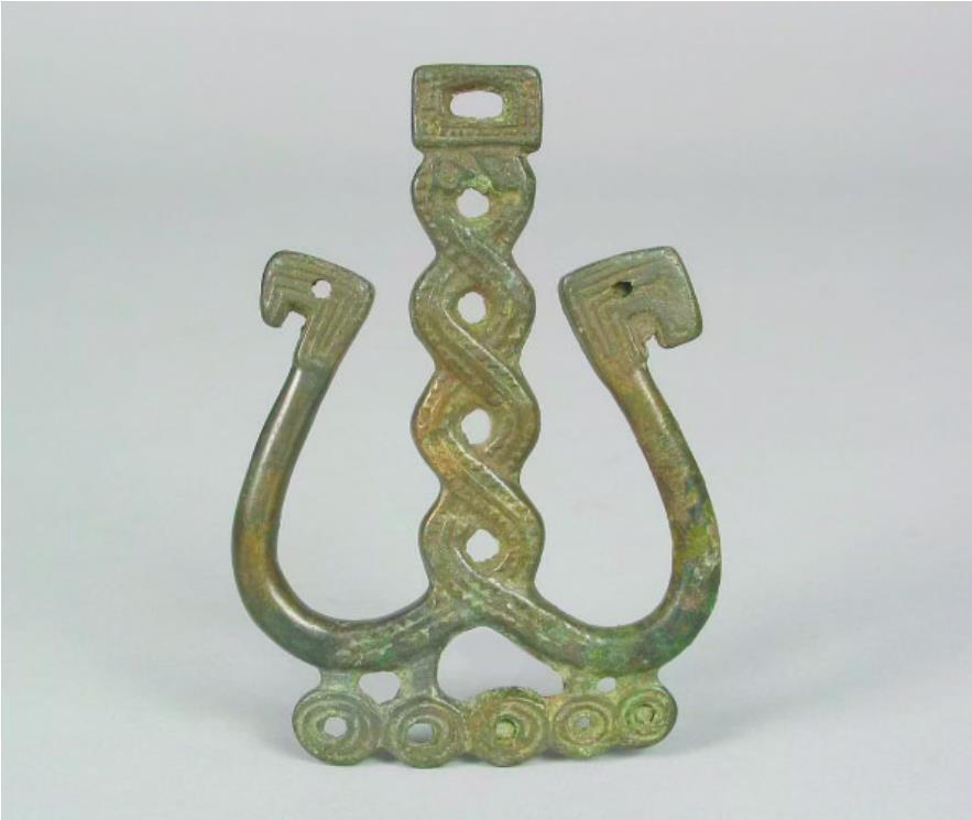“双蛇纠结铜具”整体似锚形。中间两条蛇盘曲缠绕形成4个椭圆,蛇头顶一方形系环,蛇尾与两只似凤鸟之类的动物相连,首方折,喙如钩。底足为5个联珠式装饰。通身嵌绿松石。这件器物推测应是一件华丽的马具,体现了北方先民重蛇、崇蛇的传统。