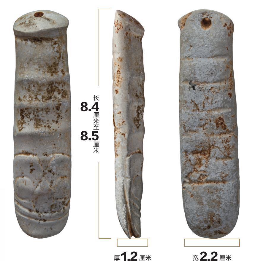 在此次展览中,一件蛇状玉耳坠以图片形式出现在游客面前。这件耳坠呈灰白色,蛇的头部嘴巴、眼睛清晰可见,且非常光滑。大小约等于成年人食指中指并在一起。