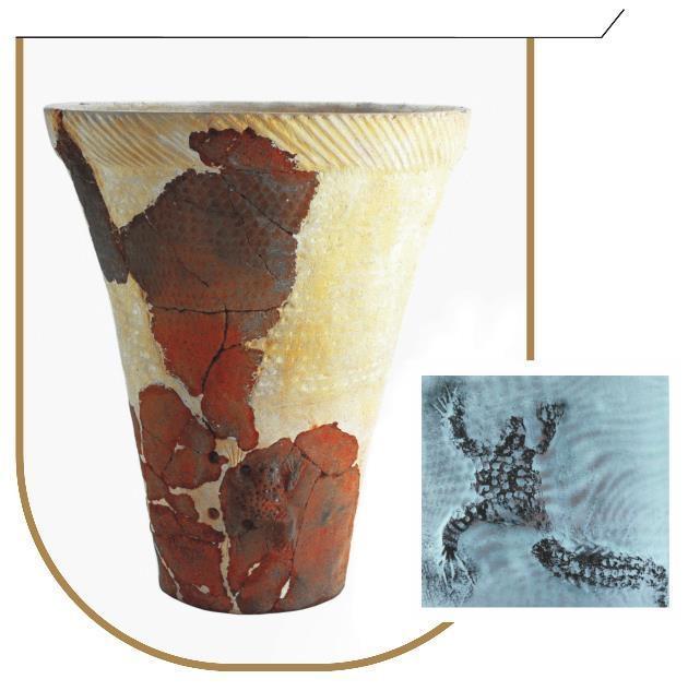 蛇衔蟾蜍纹筒形陶罐,背面有蛇衔蟾蜍图案,查海遗址出土。右下为图案拓片。