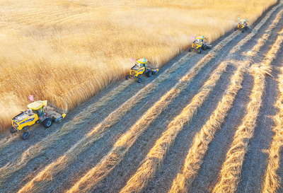 图为辽宁盘锦,收割机在苇田里作业。 谢 刚摄(影像中国)