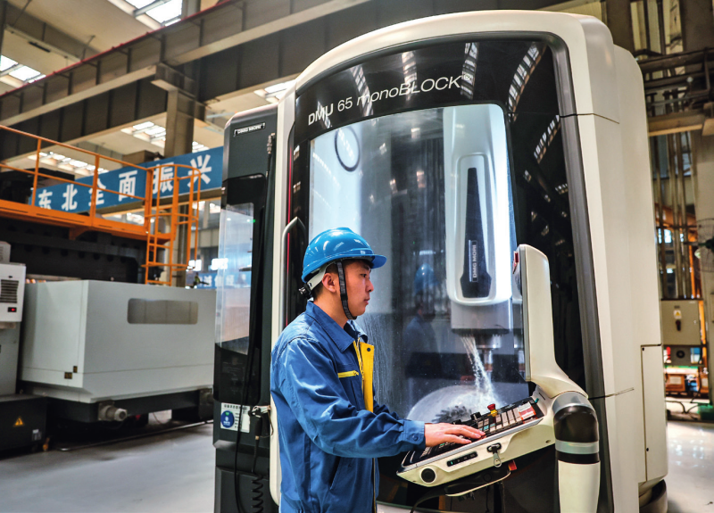 工人在沈阳鼓风机集团股份有限公司生产车间加工配件(2025 年 5 月 16 日摄) 潘昱龙摄 / 本刊