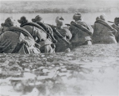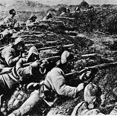 “九一八”事变后,东北各民族各阶层人民、部分爱国官兵等自发组织建立东北抗日义勇军。图为义勇军在雪地中浴血奋战。