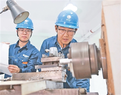 佟明(右)在带领团队成员研发带电作业工器具。 赵琦林摄