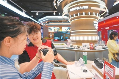 作为全国零售业创新提升试点城市,辽宁大连以“一店一策”模式推动商业焕新,依托一系列重点项目,带动区域经济发展、产业结构优化和就业增长,为商业繁荣注入新活力。图为日前,大连天津街京东MALL商场的摄影摄像销售专员向顾客推荐照相机。